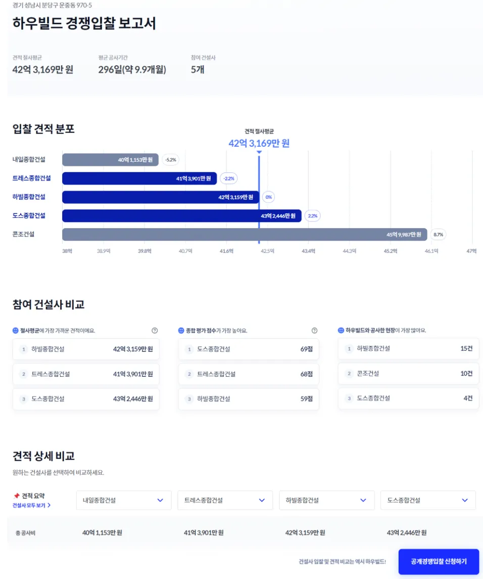 3,000개 건설사의 다양한 건축 견적을 받아 합리적으로 비교해 볼 수 있는 하우빌드의 핵심 서비스 입니다. 설계 도면에 표기된 시공 오류를 검토하고, 동일한 내역을 기준으로 간편하게 견적을 비교할 수 있습니다. 또한, 건설사의 신용등급, 보증가능금액, 최근 3개년 재무제표, 하우빌드 준공현장 등을 담은 건설사 리포트를 통해 공사를 진행할 수 있는 최적의 건설사를 간편하게 찾아볼 수 있습니다.