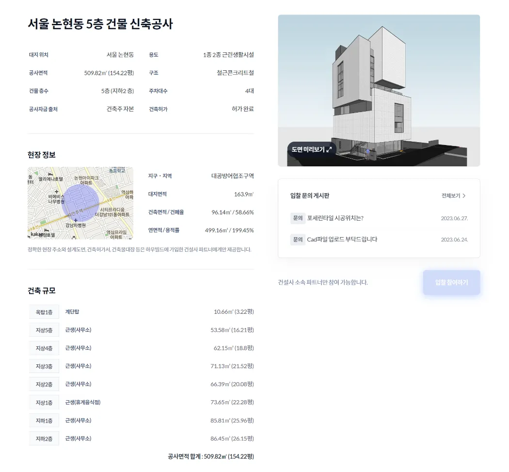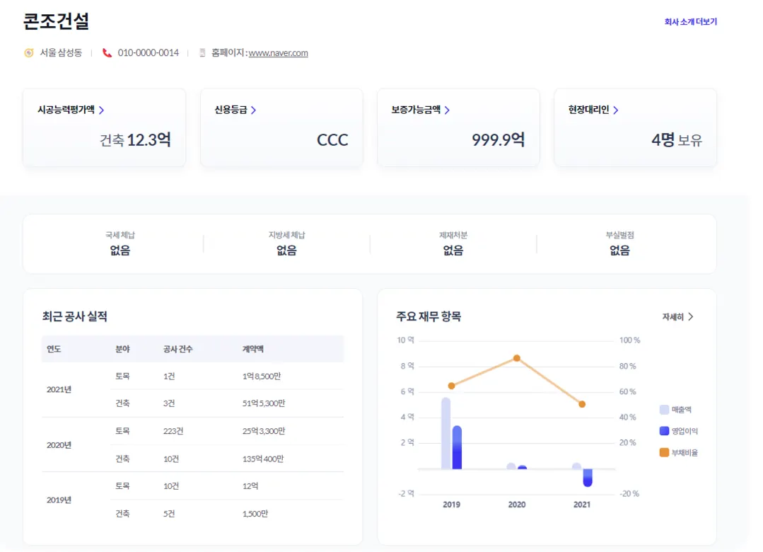 입찰이 마무리되면, 참여 건설사에 관한 업체 정보도 확인이 가능합니다.