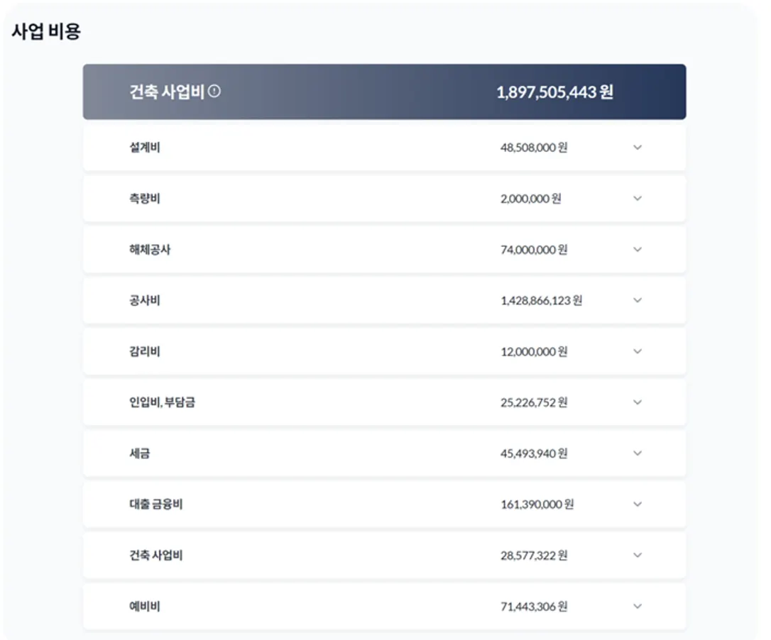 하우빌드 사업계획서는 건축사업을 진행하는 데 있어 발생할 수 있는 모든 예상 비용을 산출하고, 계획의 첫 단추인 예산 수립을 하실 수 있도록 도움을 드리고 있습니다. 공사비의 경우 이 만 여 개가 넘는 하우빌드에 축적된 공사비 데이터를 바탕으로 산출되고 있습니다.