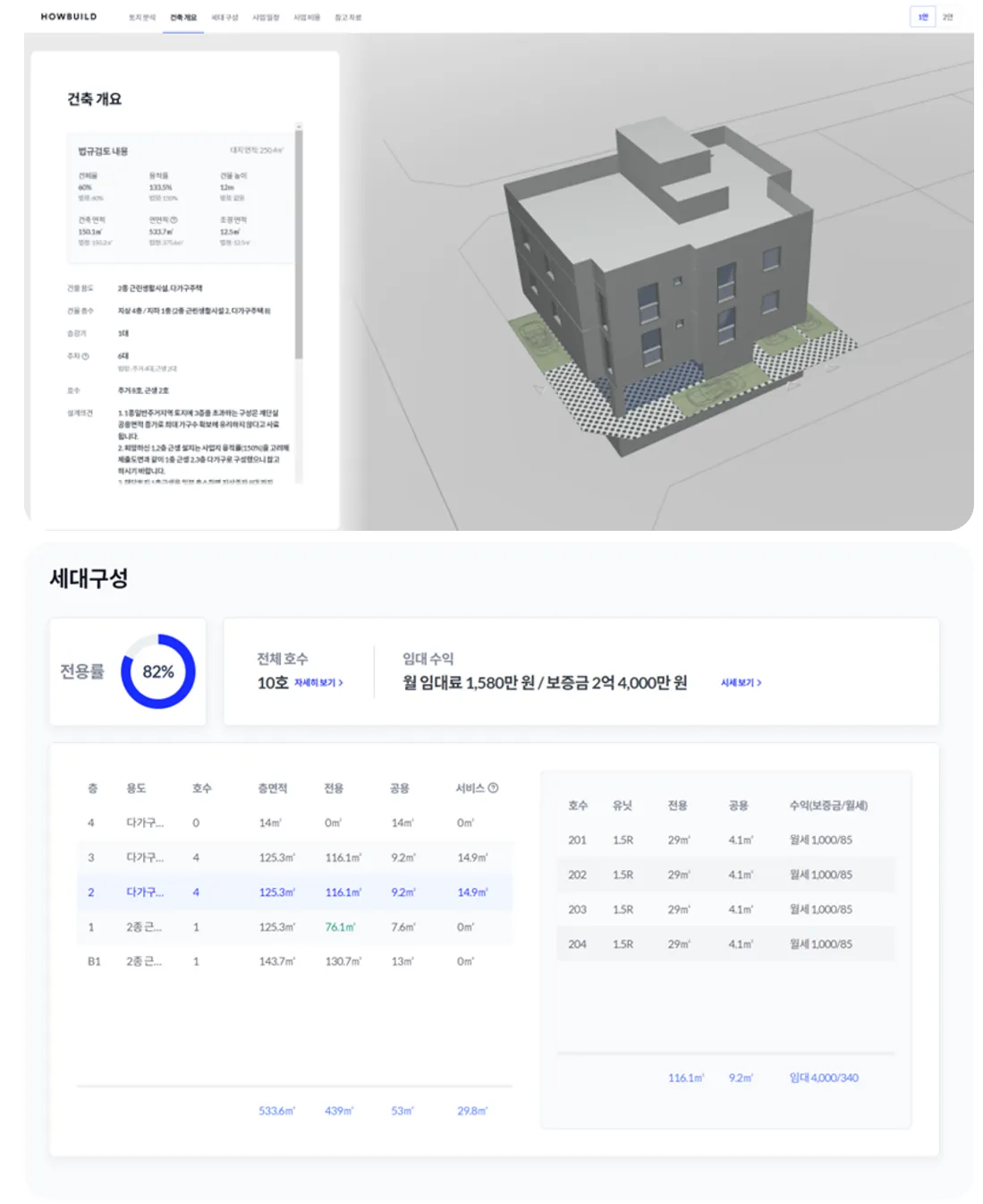 상업용 건축을 희망하시는 분들이라면, 수익성과도 가장 밀접하게 연결되어 있는 법적으로 허용하는 유효 임대(혹은 분양)면적 또한 확인하실 수 있습니다. 하우빌드 사업계획서는 예상 가능 규모를 확인하실 수 있도록 건축개요와 층별 면적 구성을 제공하고 있습니다.